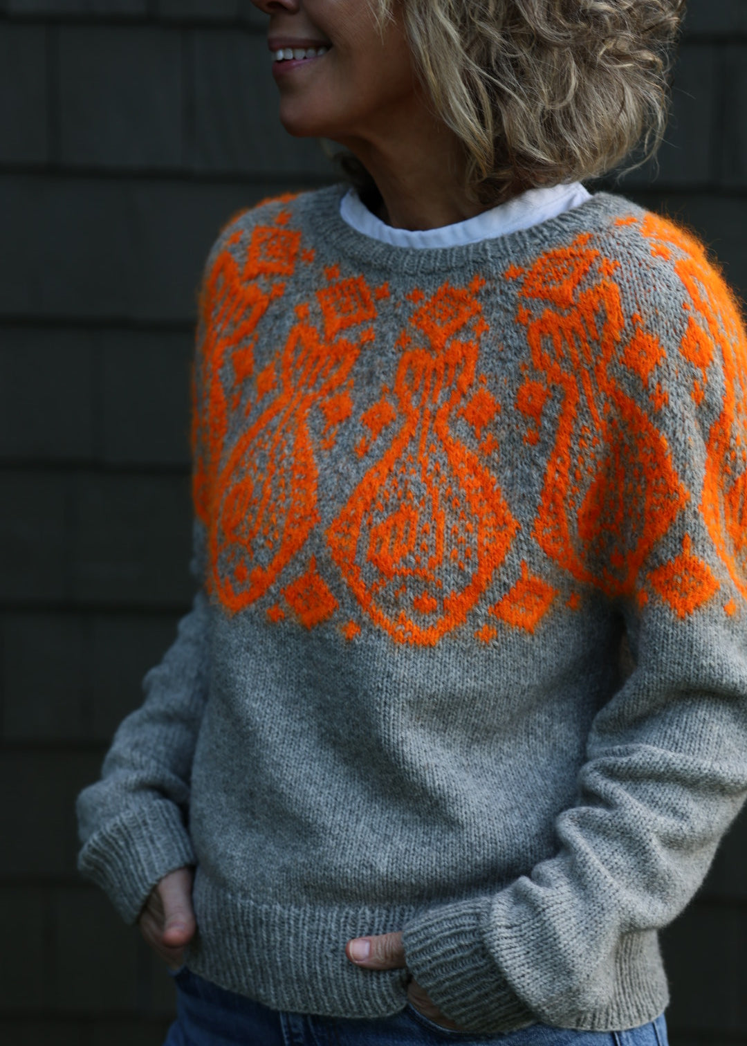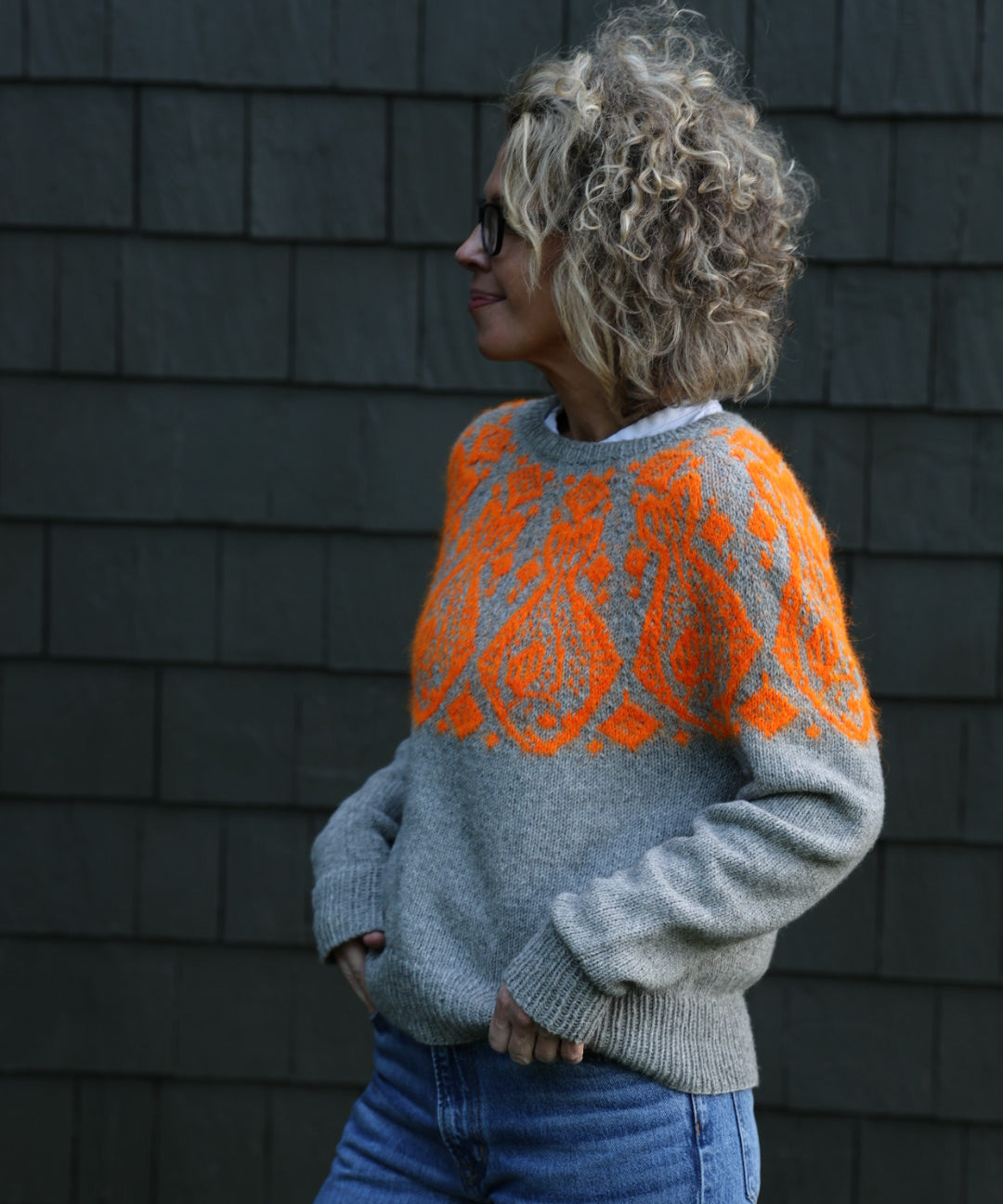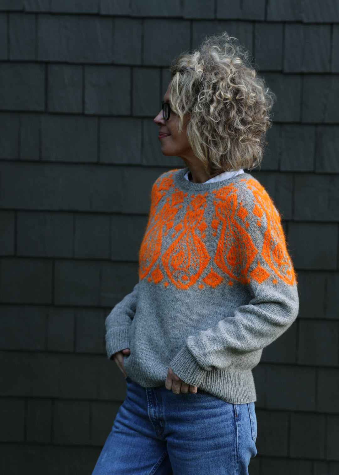 Who says neutrals have to play it safe? A good old sweatshirt gray gets a splashy upgrade when you toss in some neon fish! The Halibut Sweater by Caitlin Hunter is fun, cozy, and downright adorable! We loved playing with the textures here with the woolly warmth of yak meeting the soft fuzz of Plume held double. It’s like the sweater equivalent of catching the big one: playful, unexpected, and totally worth showing off.