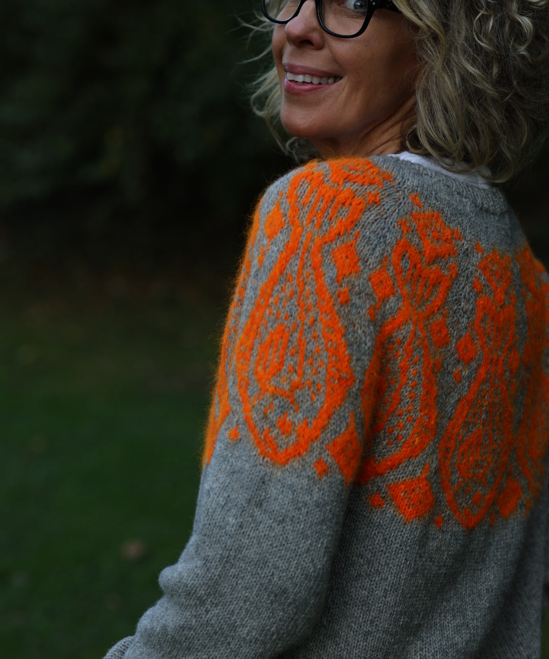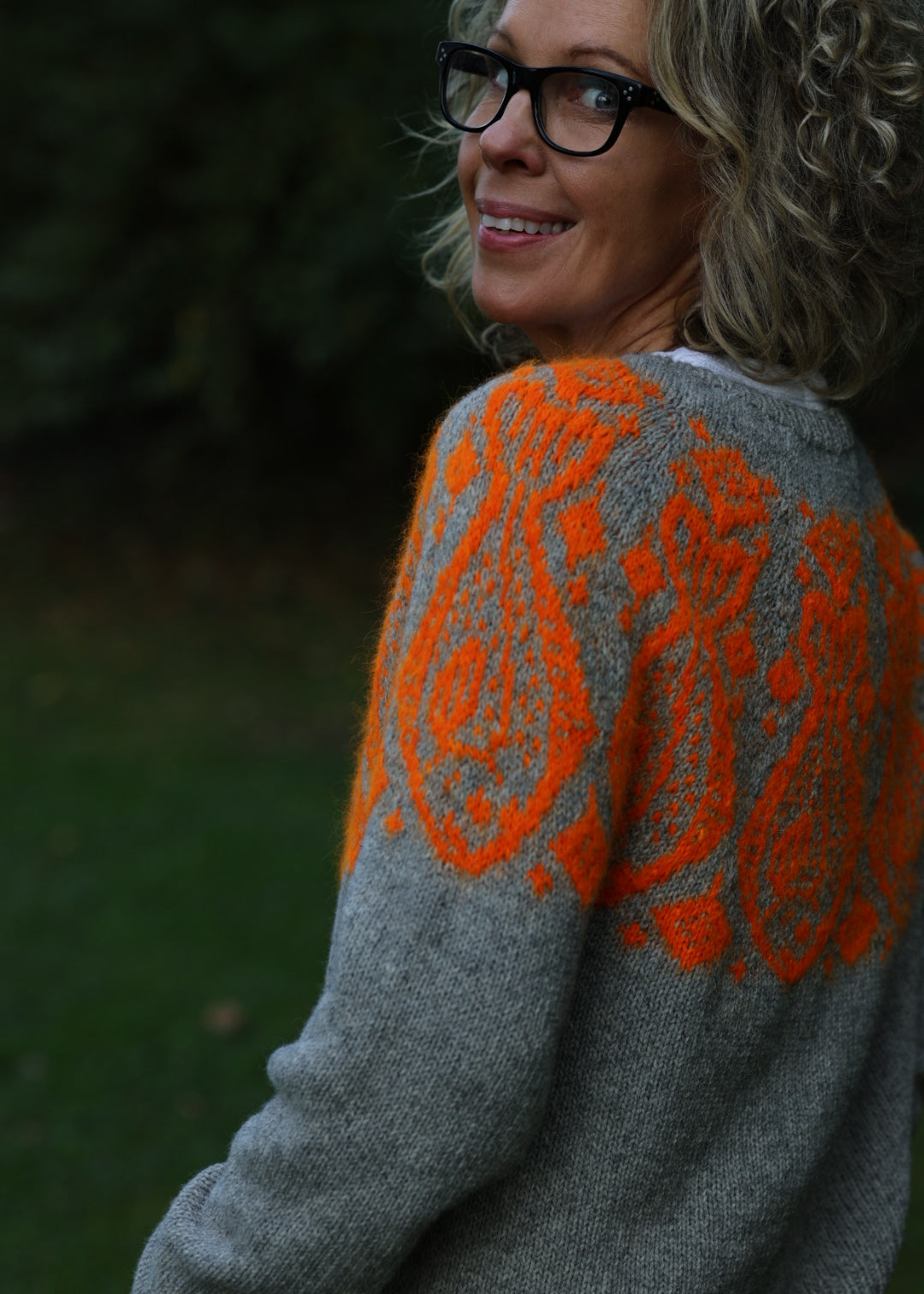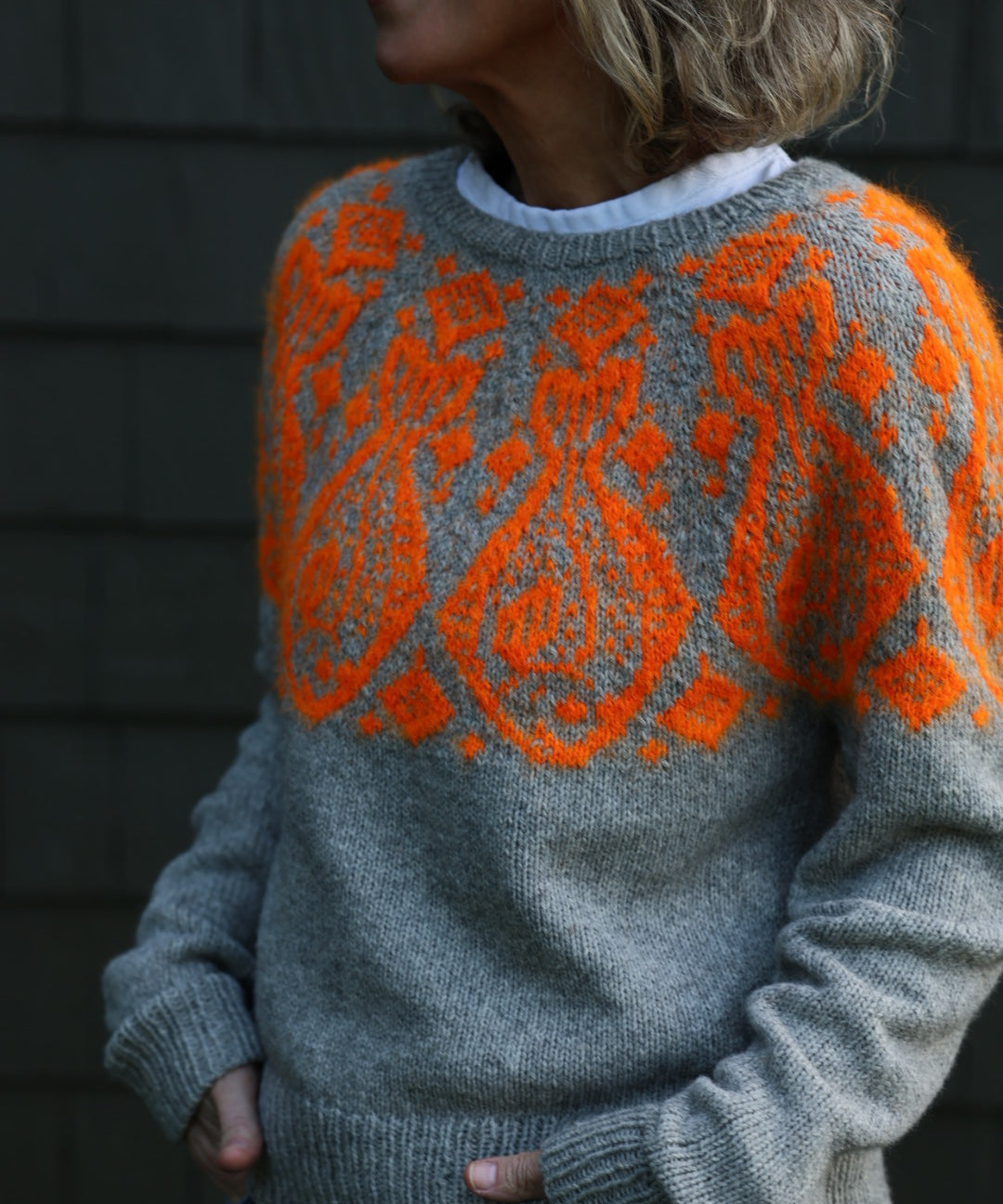 Who says neutrals have to play it safe? A good old sweatshirt gray gets a splashy upgrade when you toss in some neon fish! The Halibut Sweater by Caitlin Hunter is fun, cozy, and downright adorable! We loved playing with the textures here with the woolly warmth of yak meeting the soft fuzz of Plume held double. It’s like the sweater equivalent of catching the big one: playful, unexpected, and totally worth showing off.
