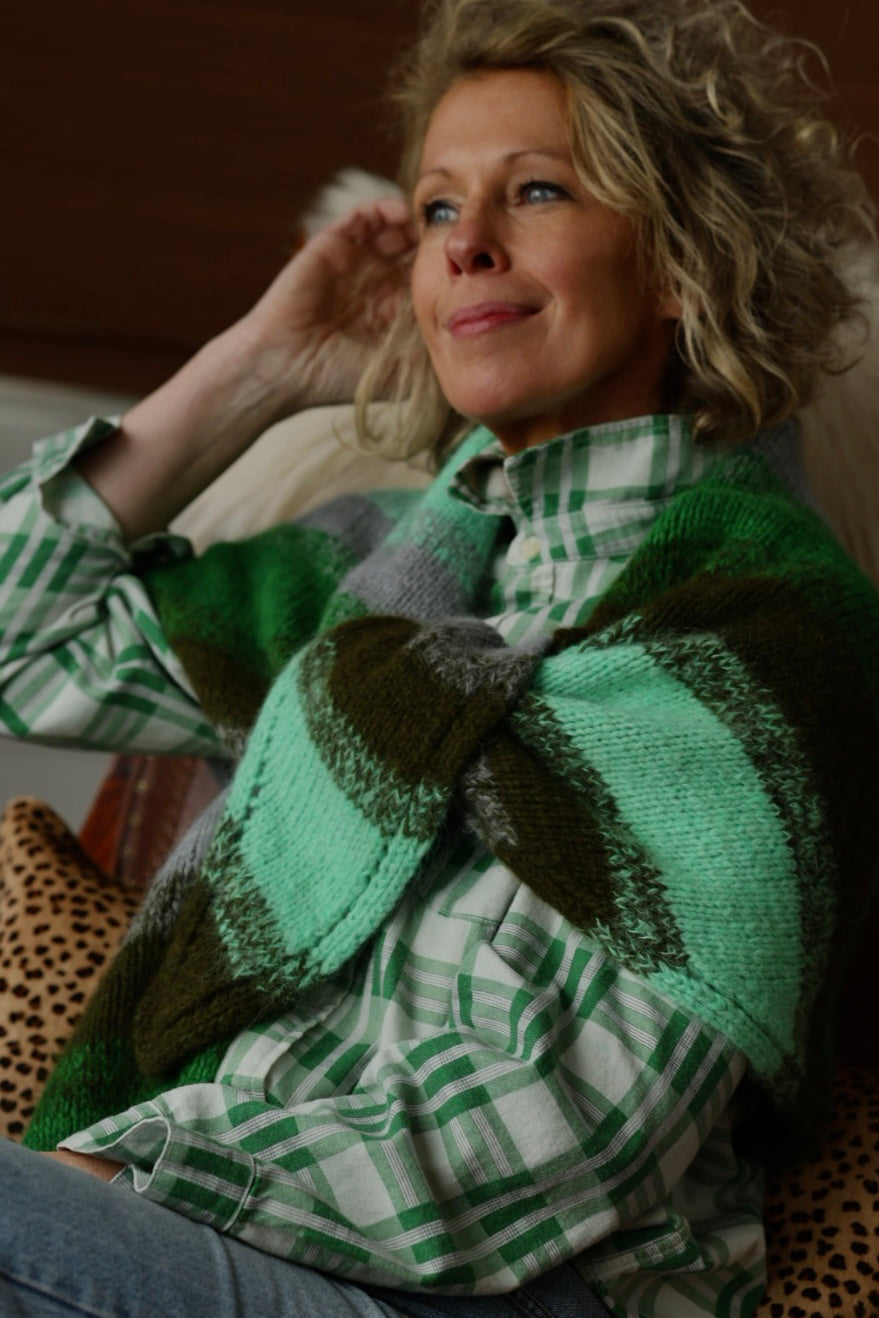 With Hazy Shades, you’ll cast on once and walk away with three distinct accessories. Each with its own personality and purpose: The Wrap is a generous (but not too generous if you know what we mean), color-blocked soft, hazy marled edges.