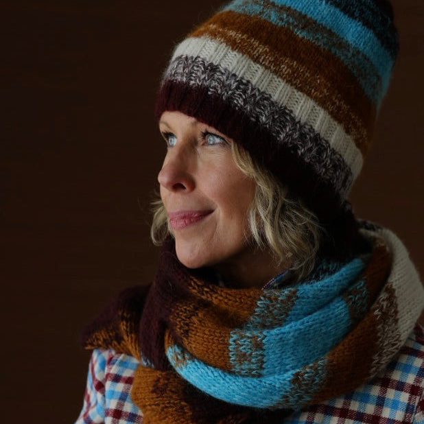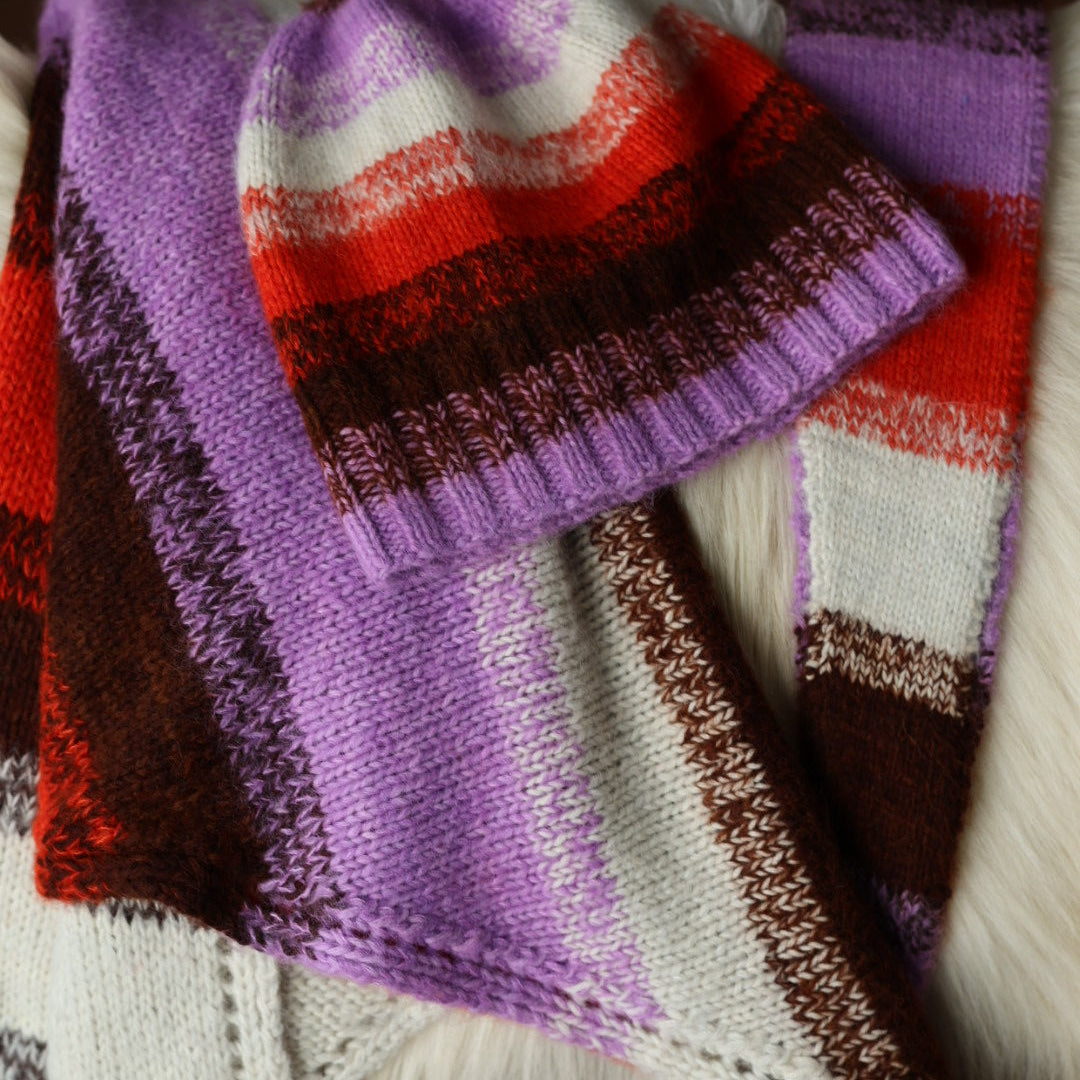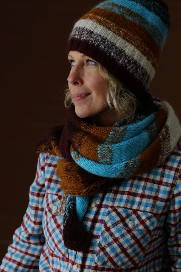 Each piece features color-block stripes paired with those signature hazy marled edges. Gets those colors and stripes mingling and glowing. It’s engaging to knit, endlessly wearable, and designed to help you use every last bit of your yarn in the best possible way.