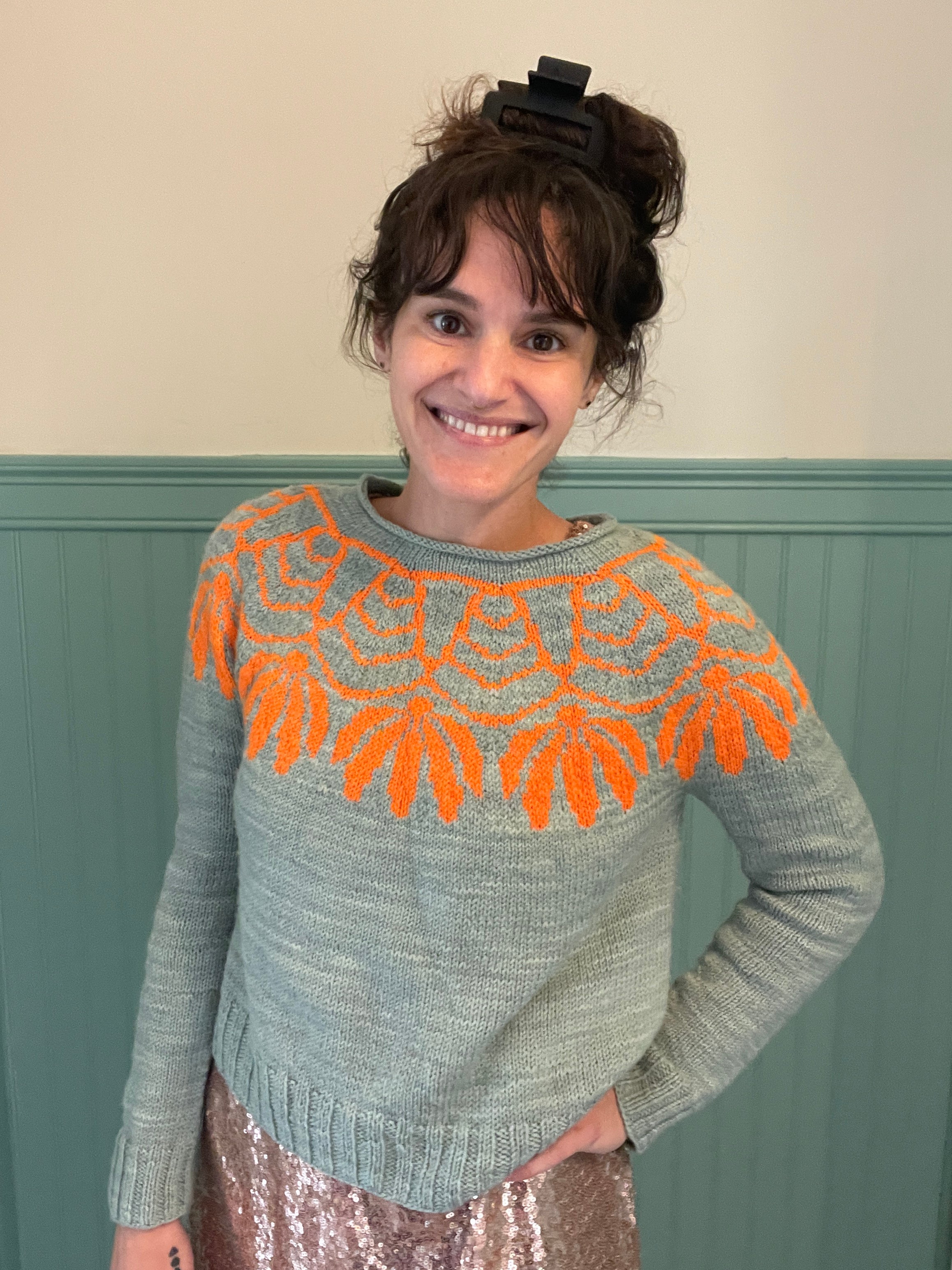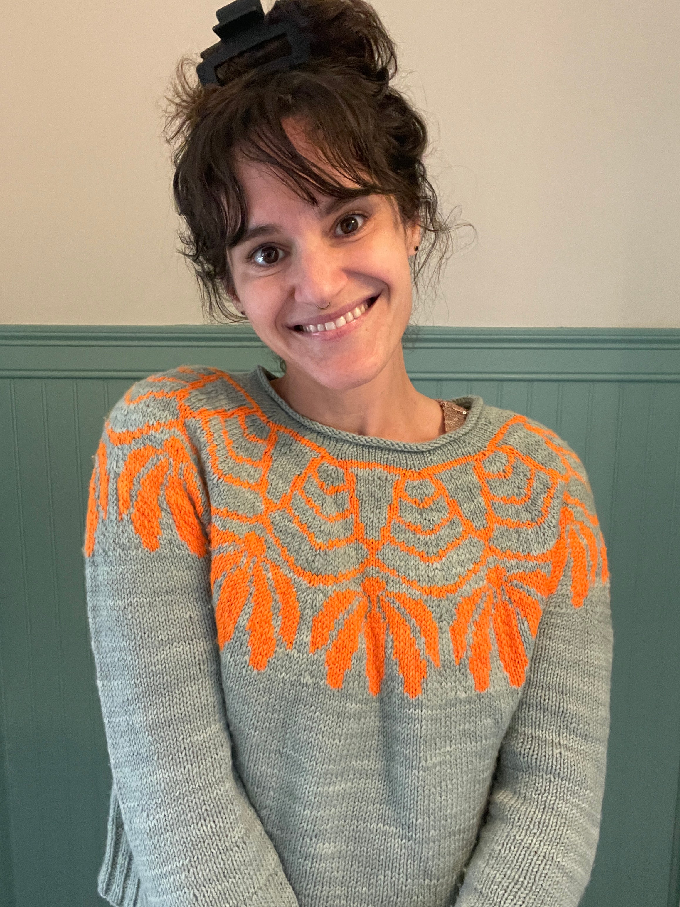 The design includes a rolled neckline, patterned yoke, and a slightly cropped, tapered waist. It’s knit up in Legacy Fingering Base, a lovely wool yarn available in a variety of beautiful shades.