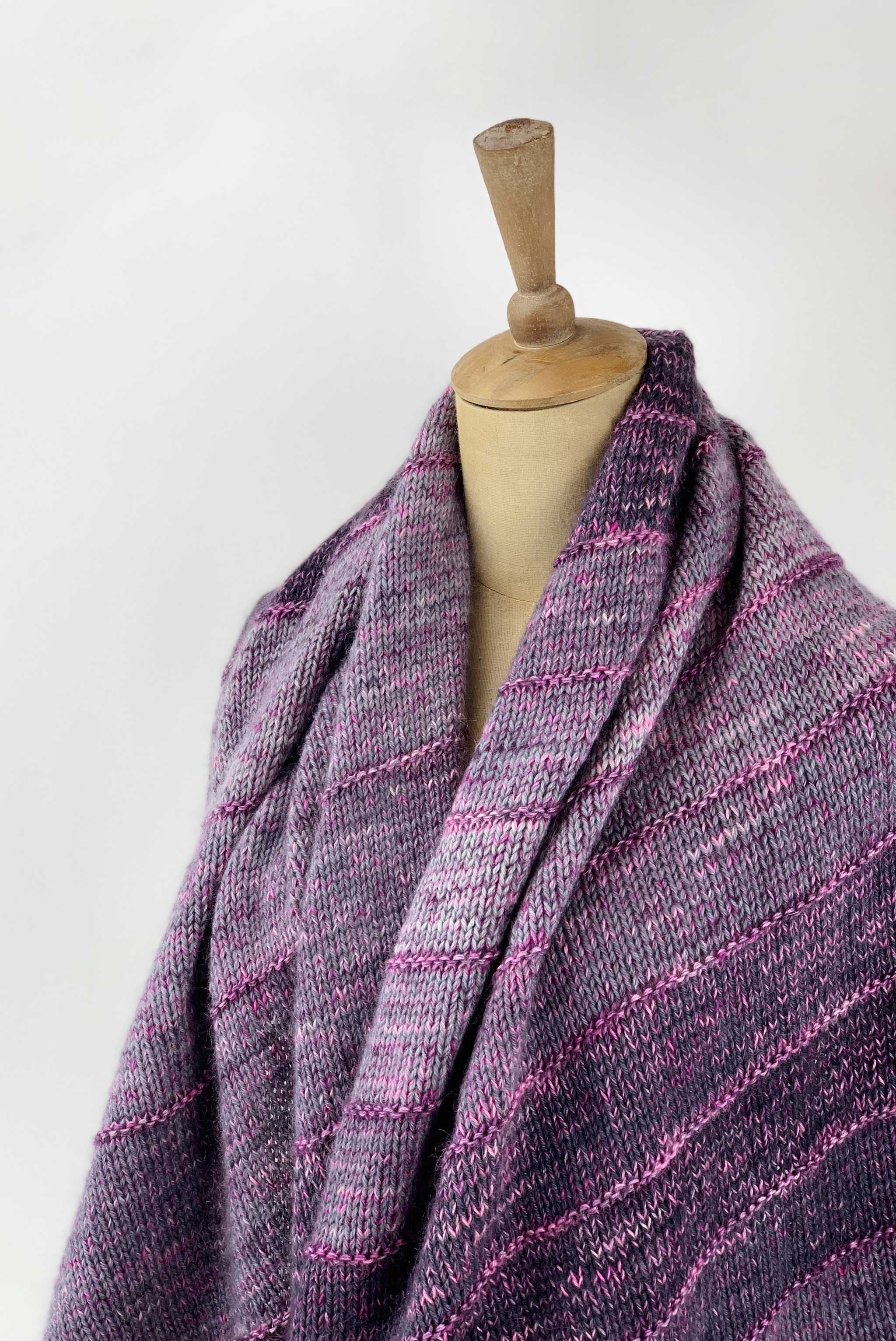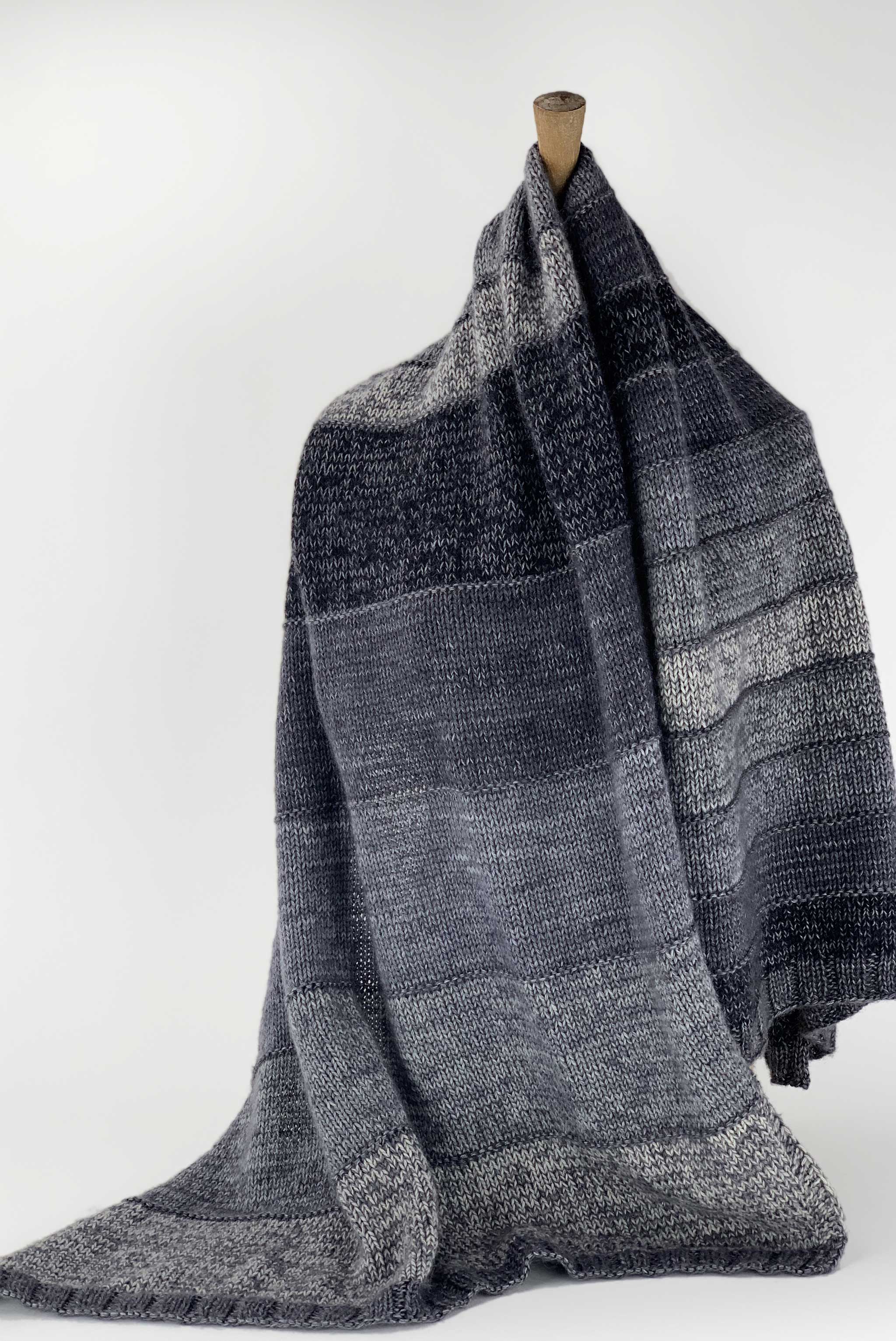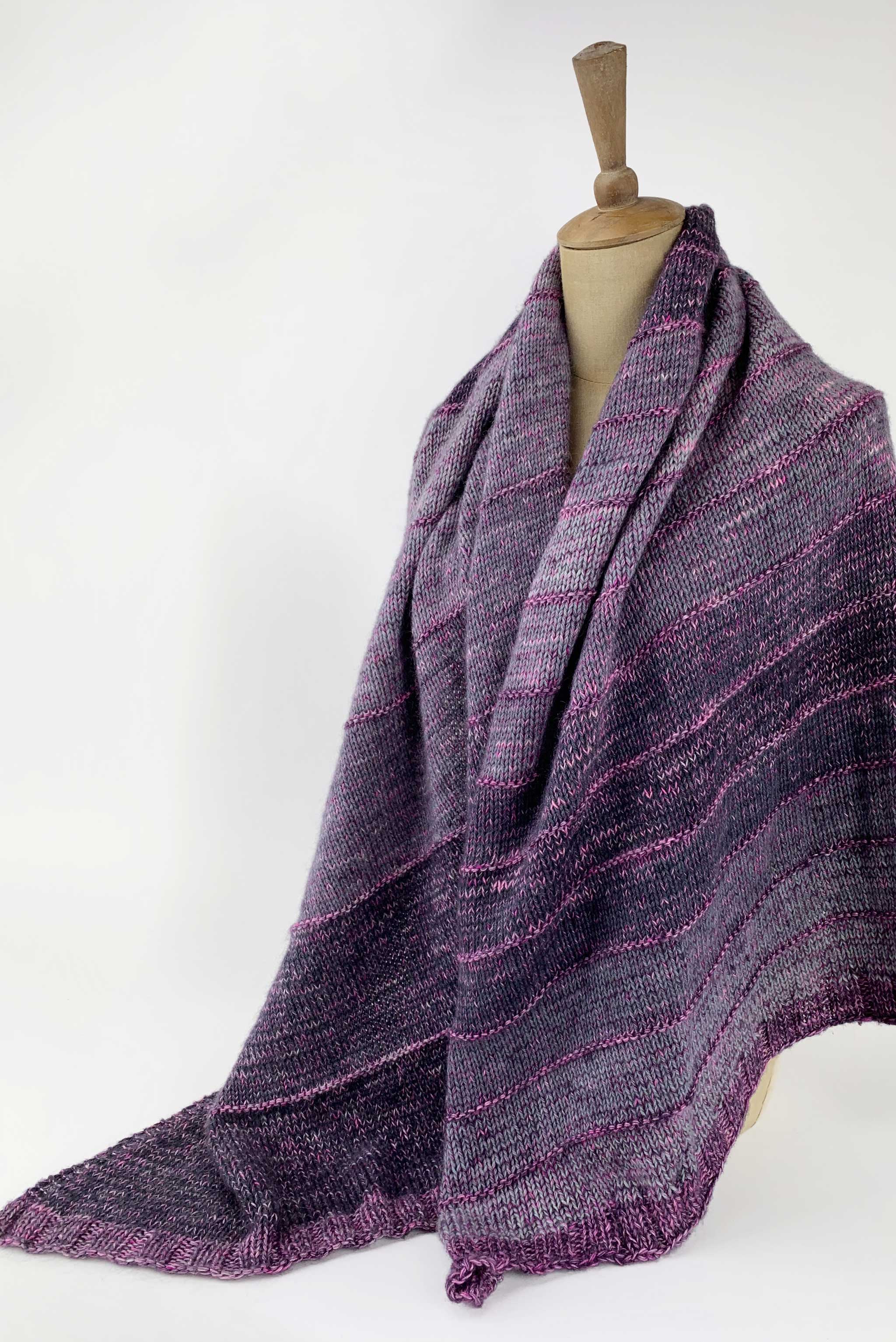 Gradient stockinette stripes are punctuated with garter bands in this simple-to-work bias wrap. Two yarns are held together to create the marled fabric, one stays constant while the other shifts across the gradient and back again.
