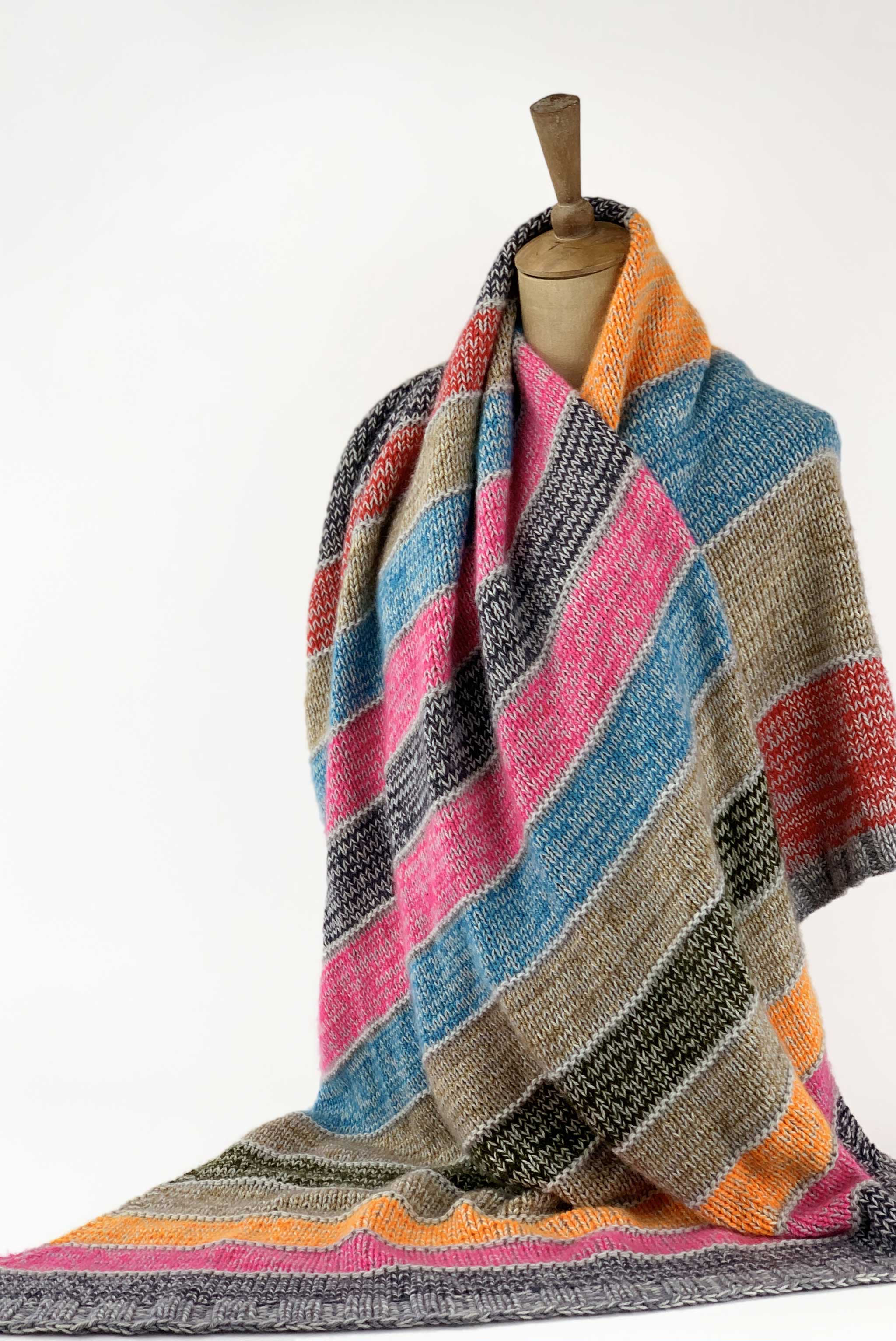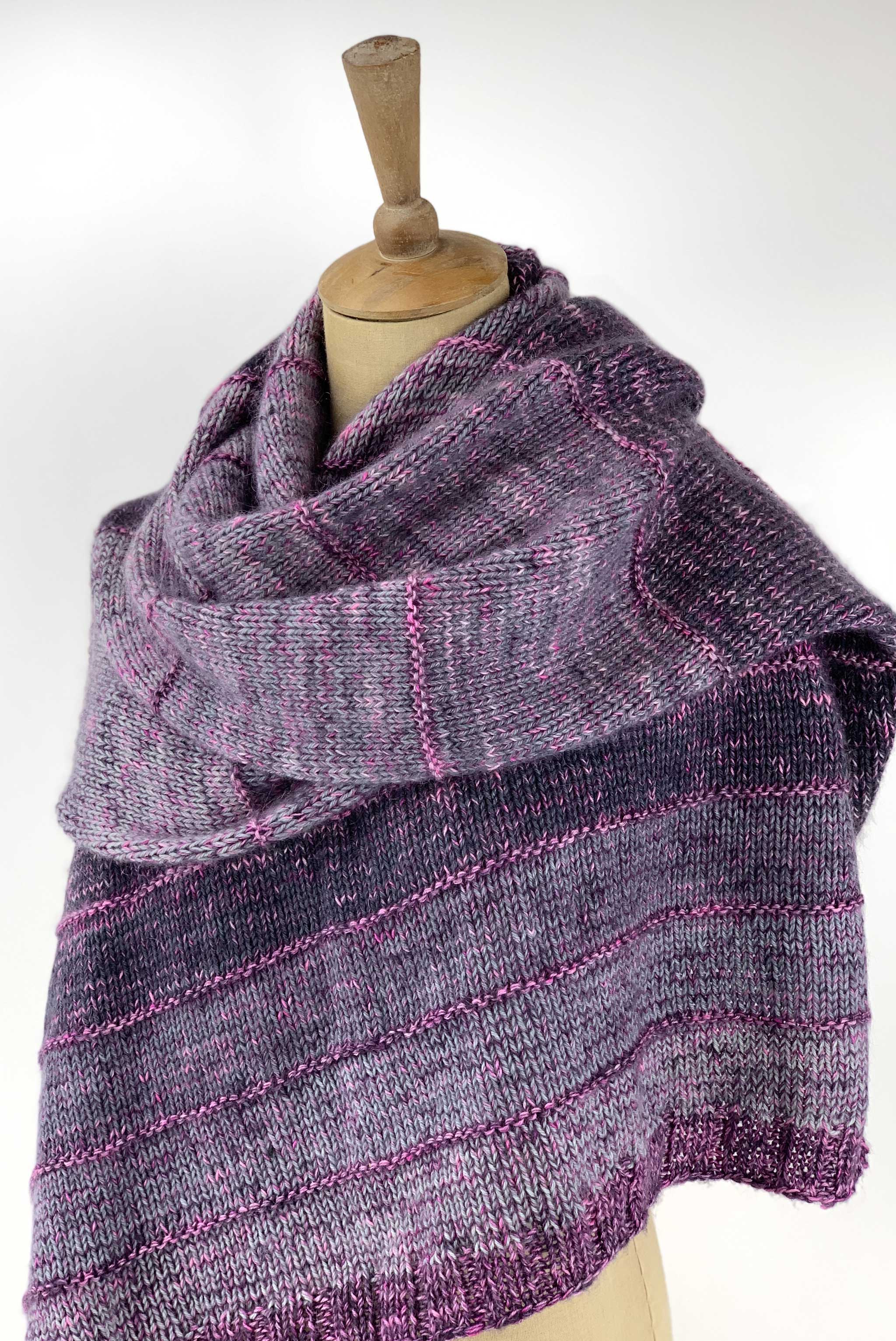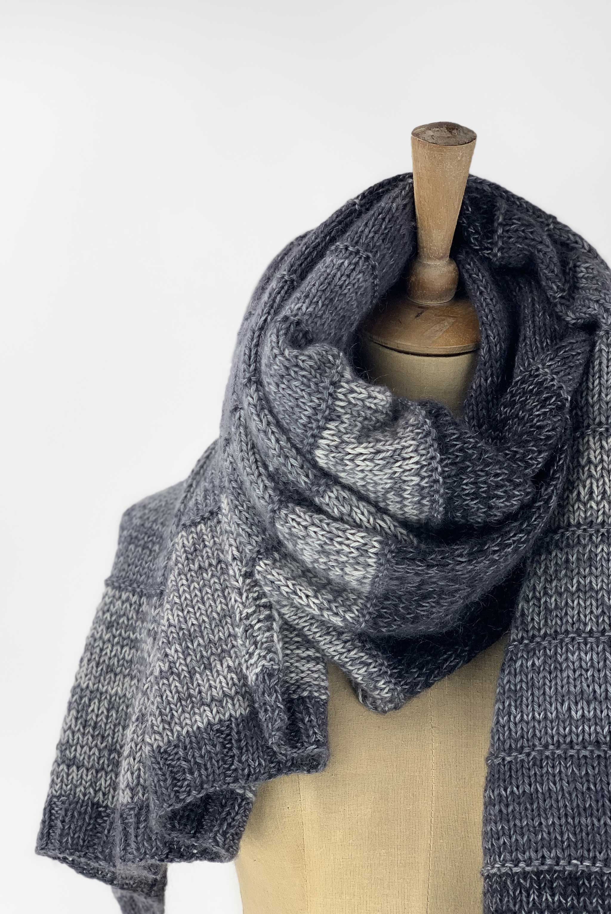 Gradient stockinette stripes are punctuated with garter bands in this simple-to-work bias wrap. Two yarns are held together to create the marled fabric, one stays constant while the other shifts across the gradient and back again.