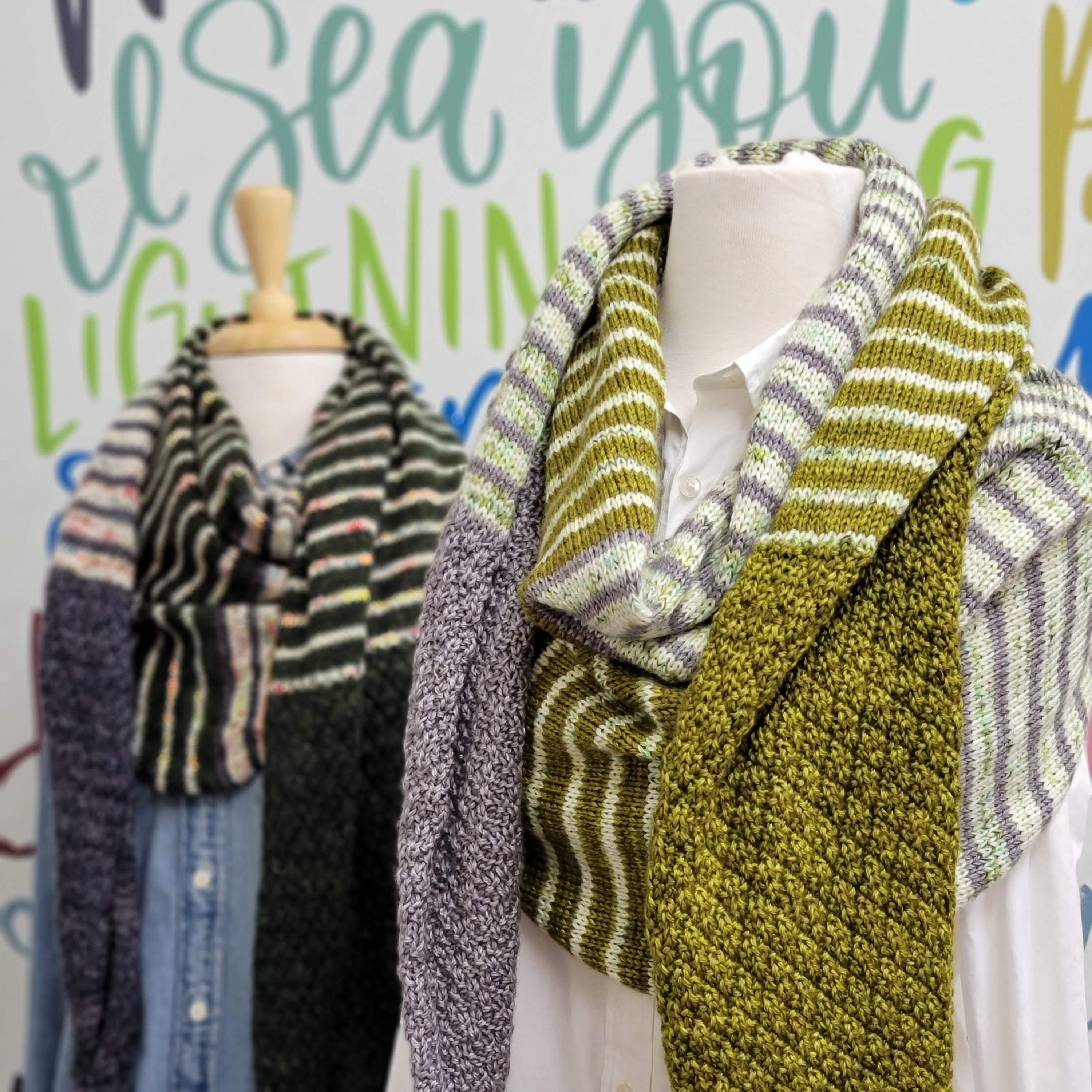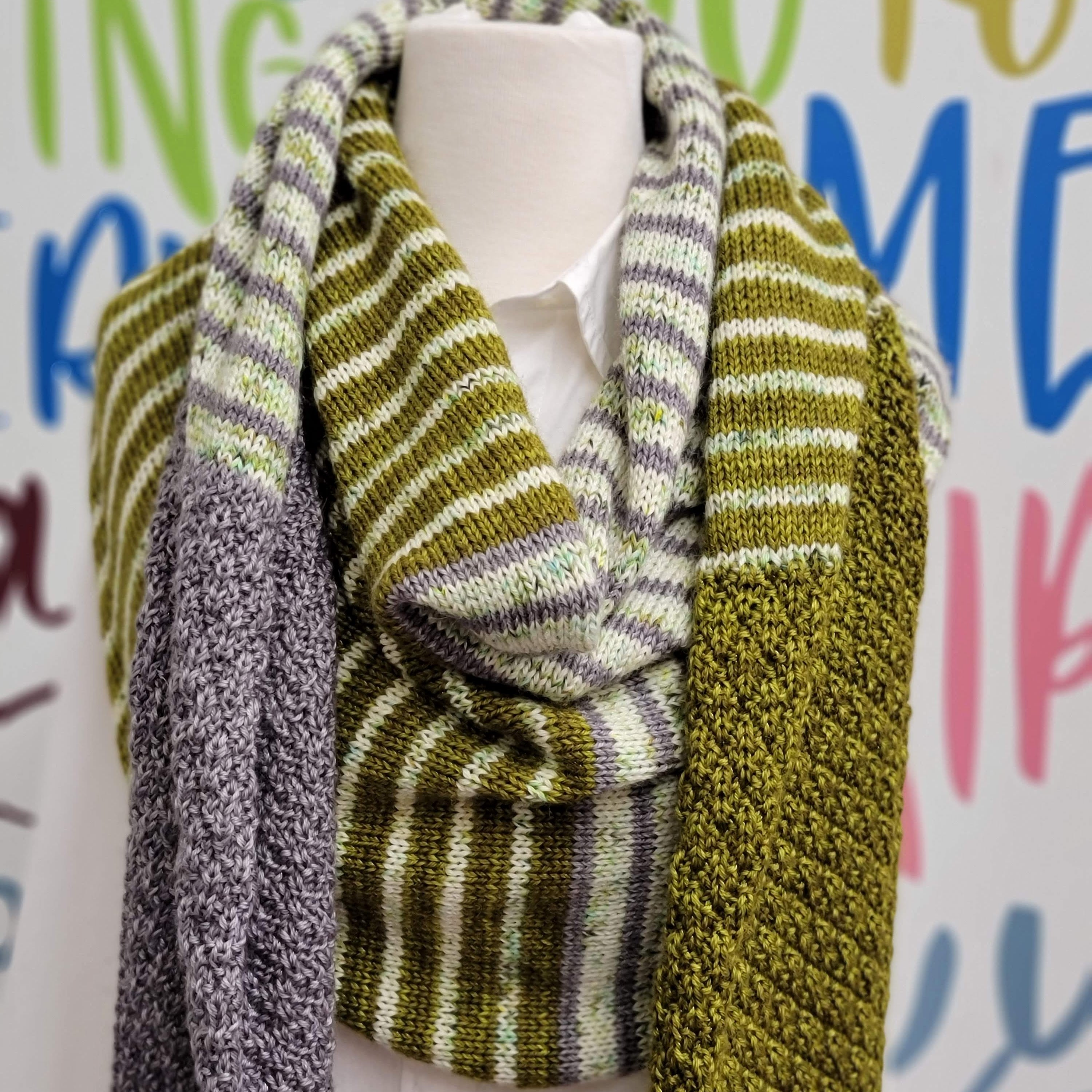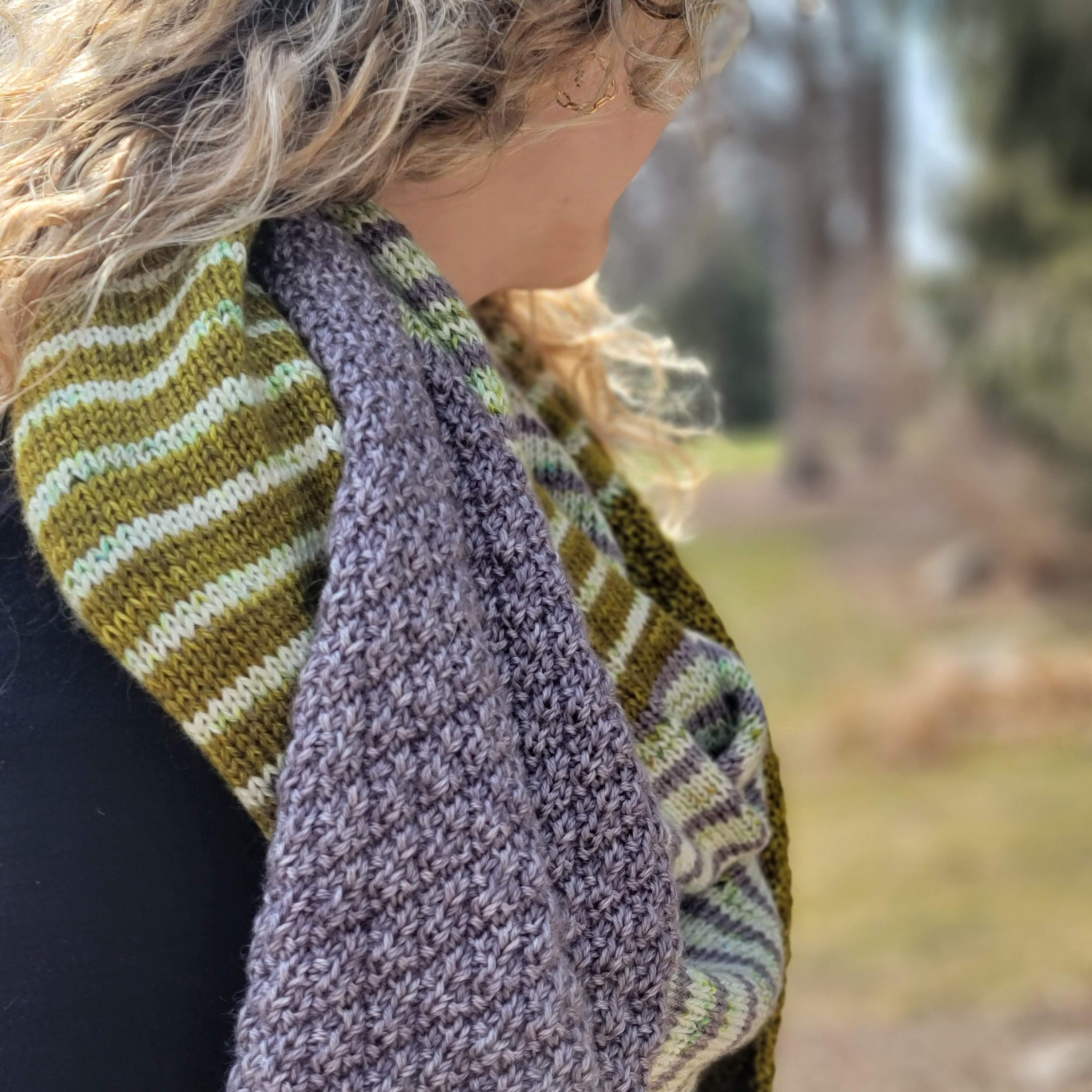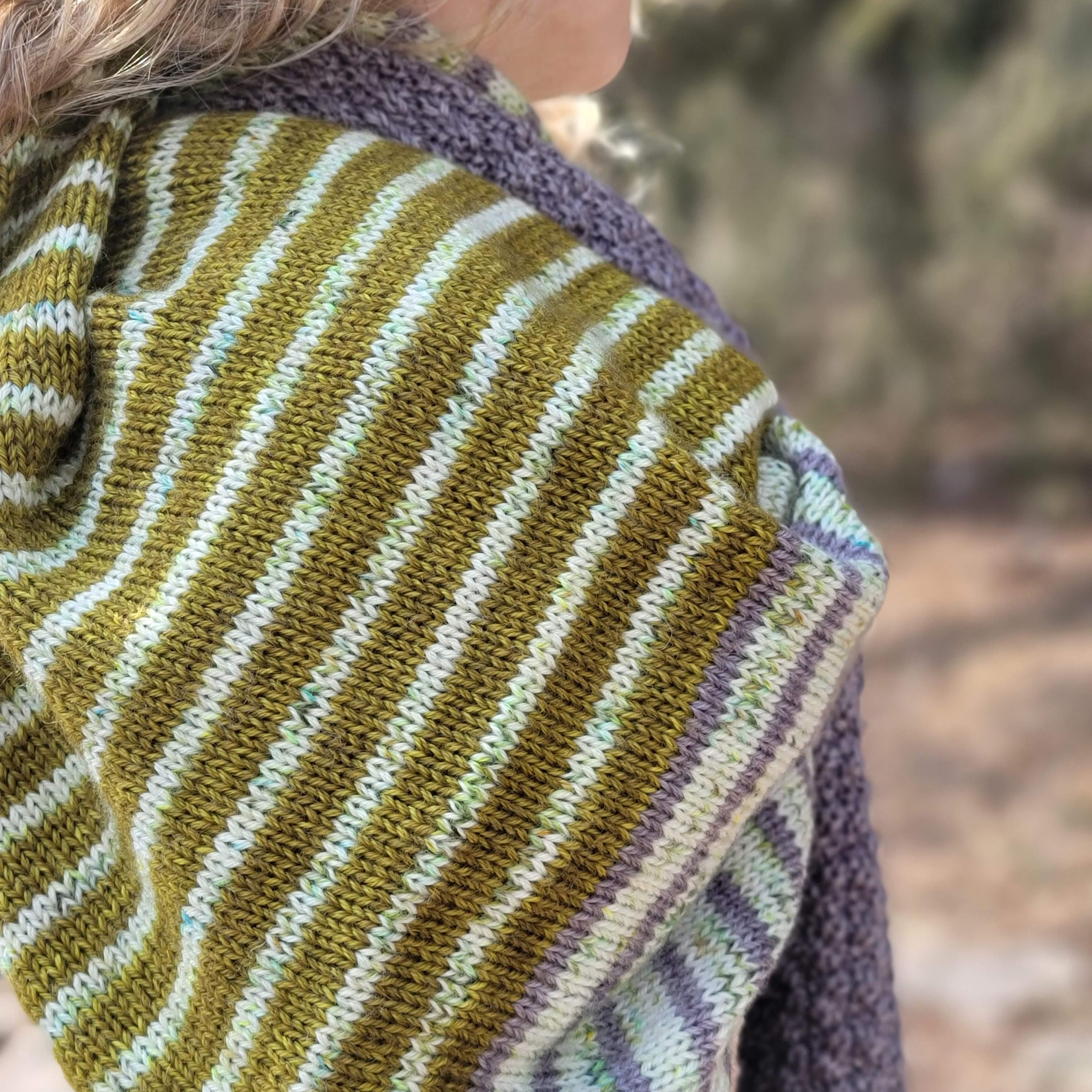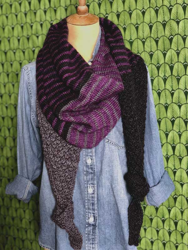 Textured sections and fun blocks of color team up in this striking, three color triangular wrap. Knit in your favorite fingering weight yarn, Druthers is a perfect, accessory for indoors or under your coat