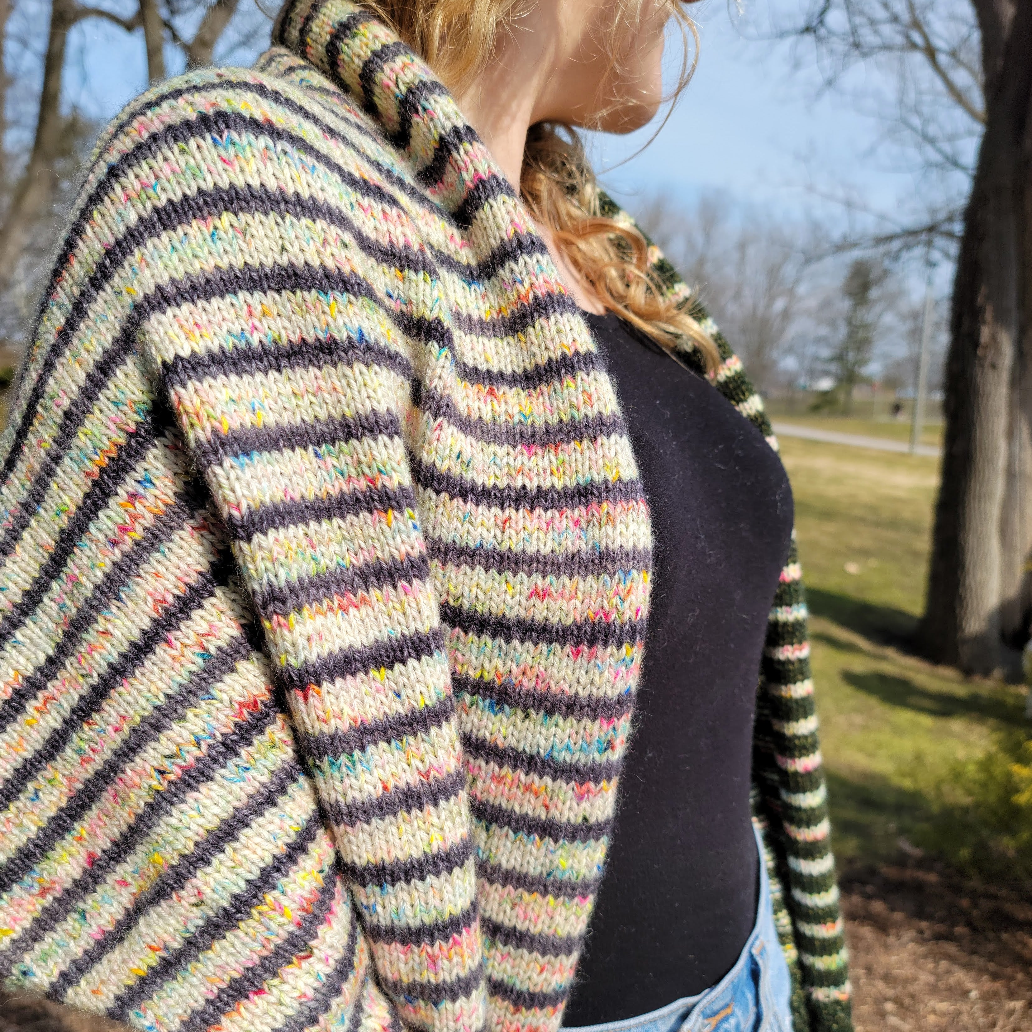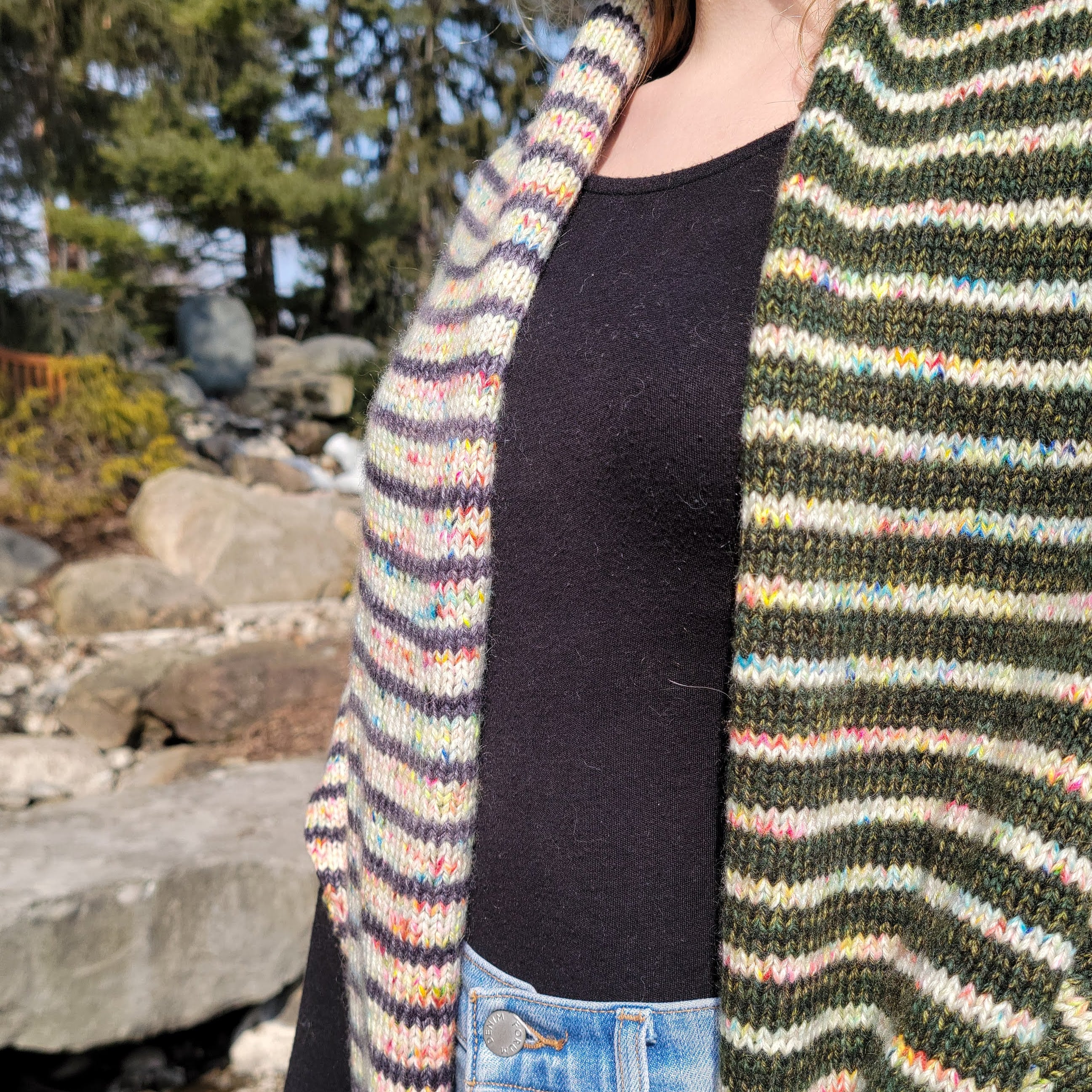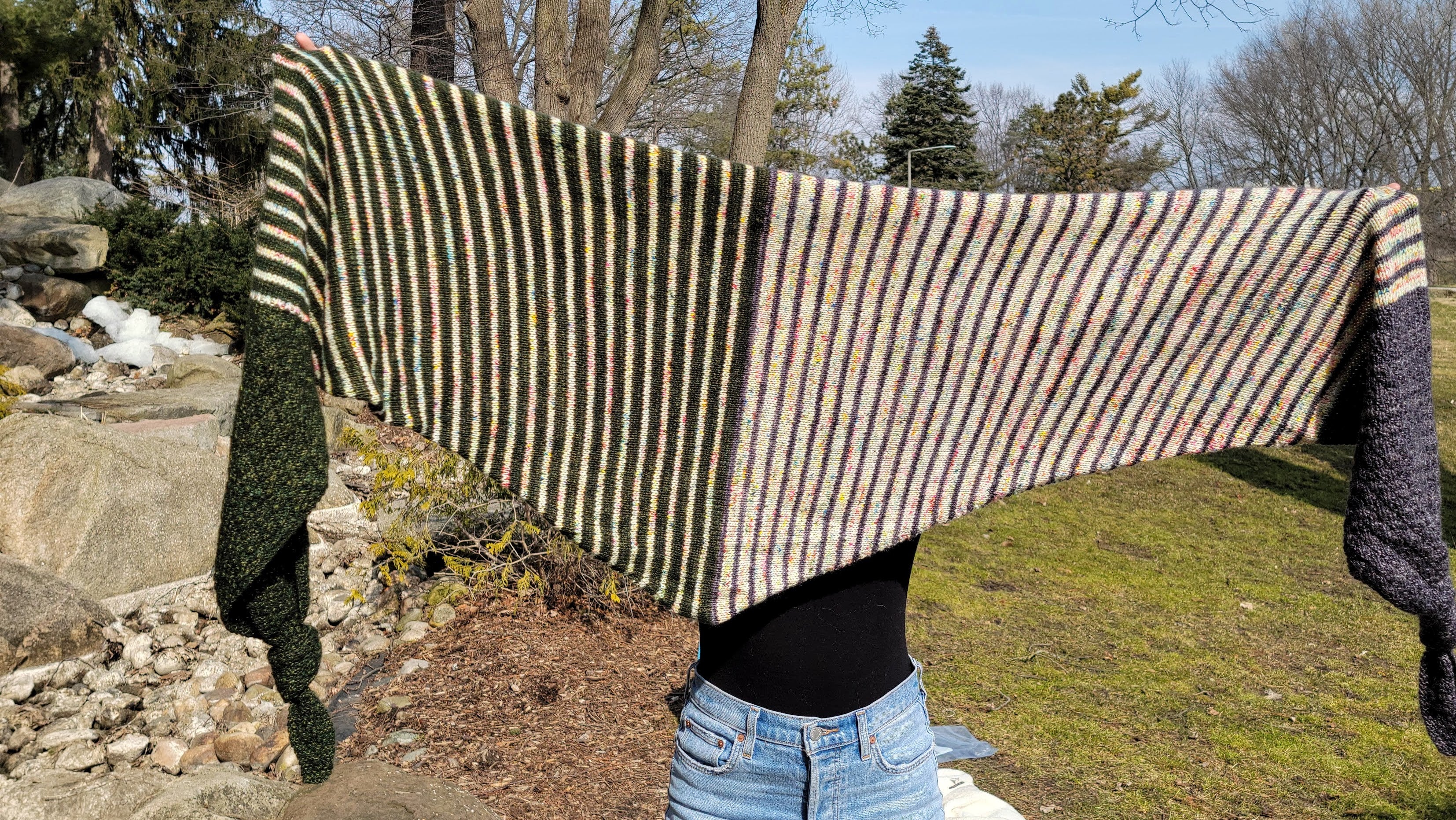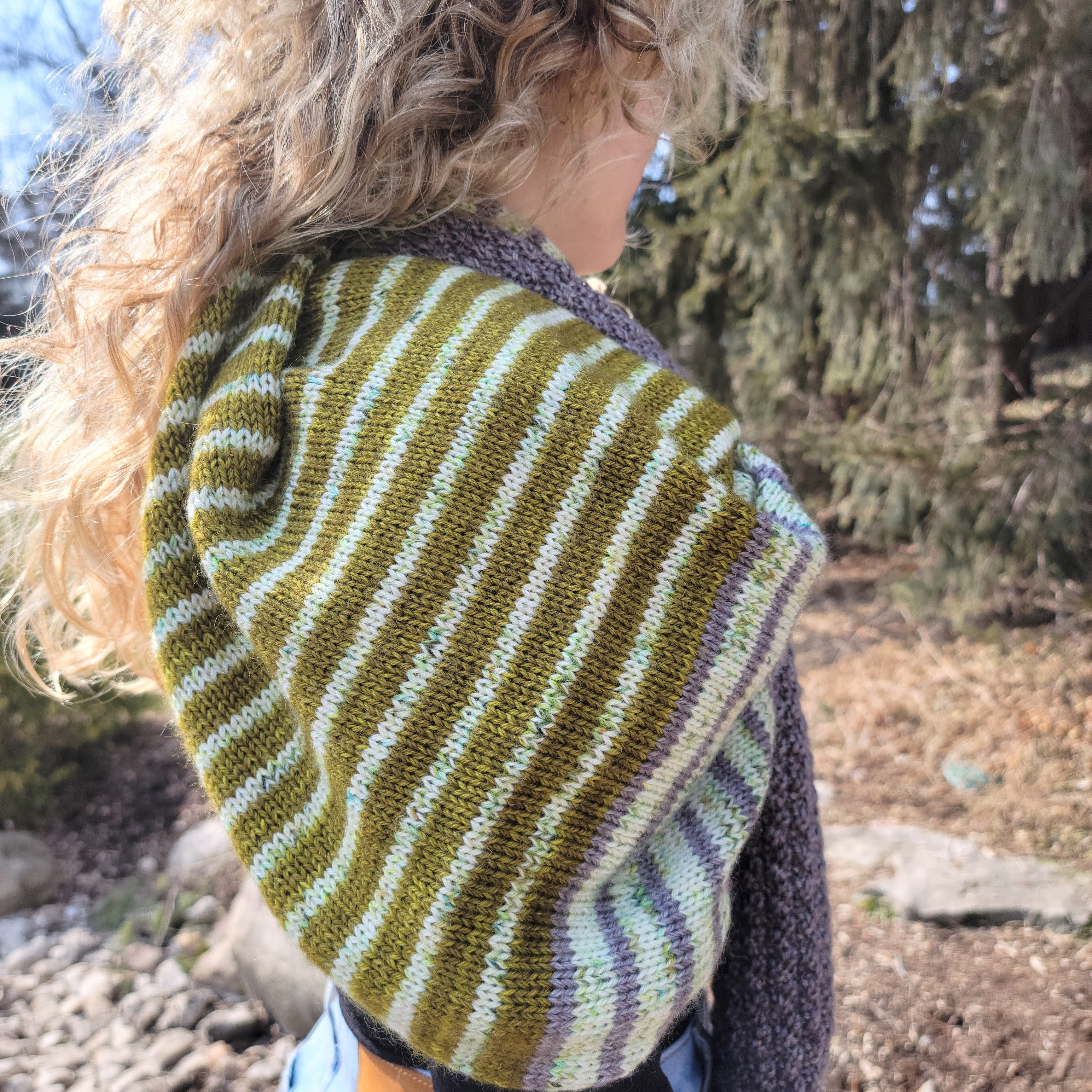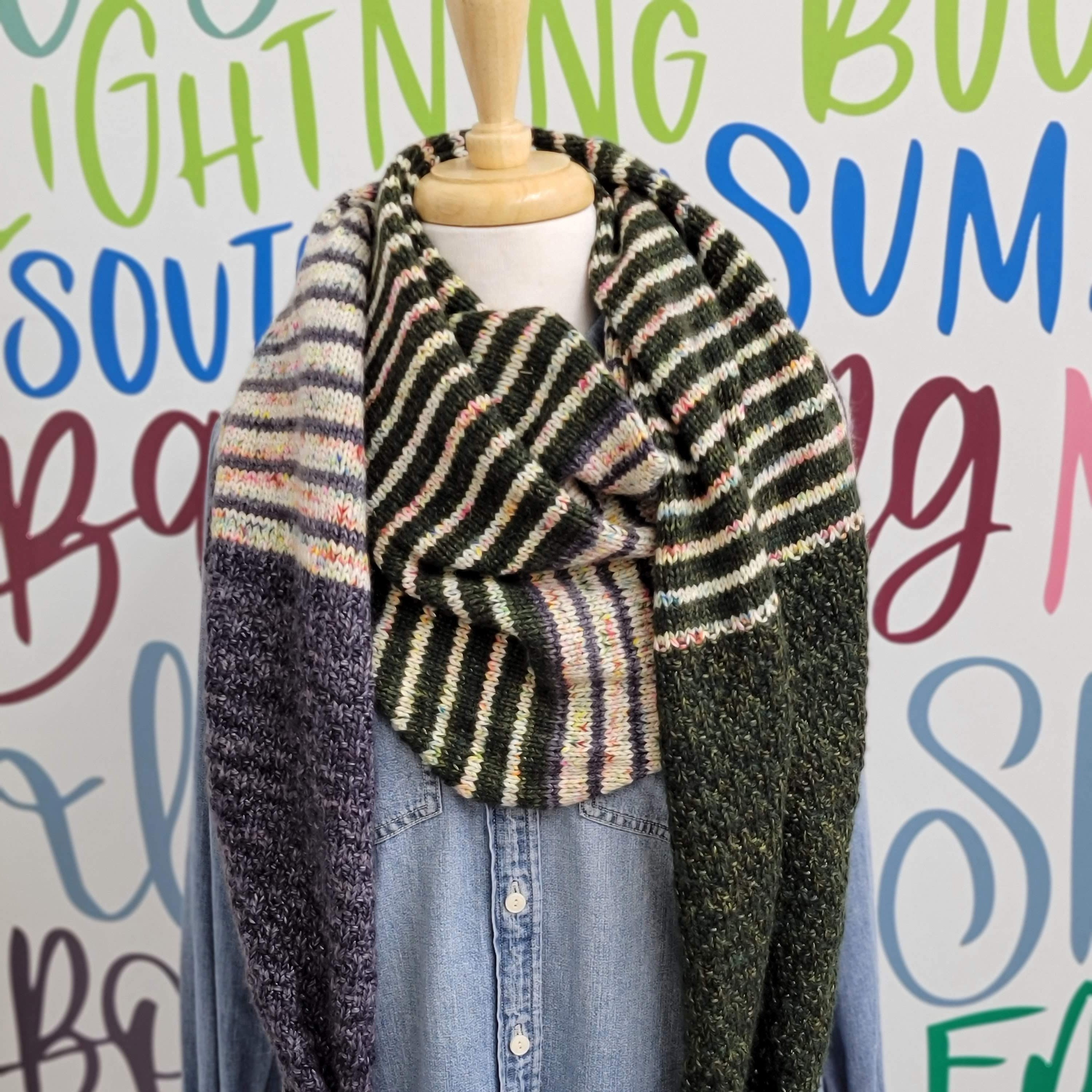 Textured sections and fun blocks of color team up in this striking, three color triangular wrap. Knit in your favorite fingering weight yarn, Druthers is a perfect, accessory for indoors or under your coat